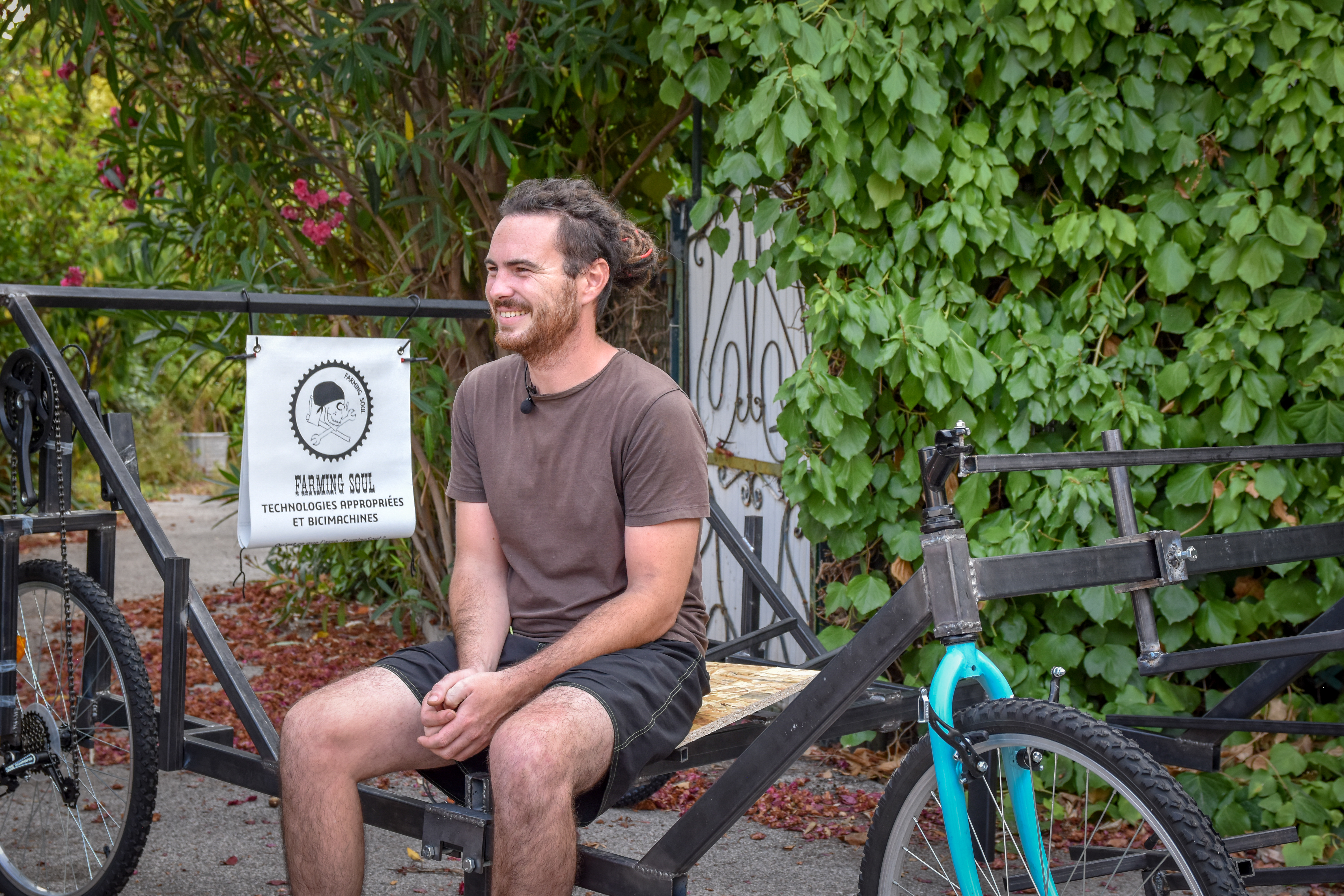 202107 Atelier Paysan Farming Soul - Kévin Piermay sur le lit de travail autoconçu et autostruit Alphonse La Pionce © Quentin Mateus - Low-tech Lab